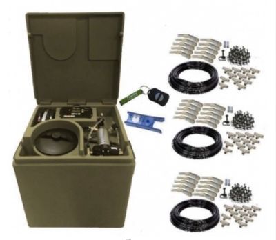 One system is powerful enough to handle 80 nozzles and 1200 ft of tubing. All components, including the 55 gallon tank are housed and protected in a 26 in cube keeping it protected from the elements. No more 55 gallon drums!